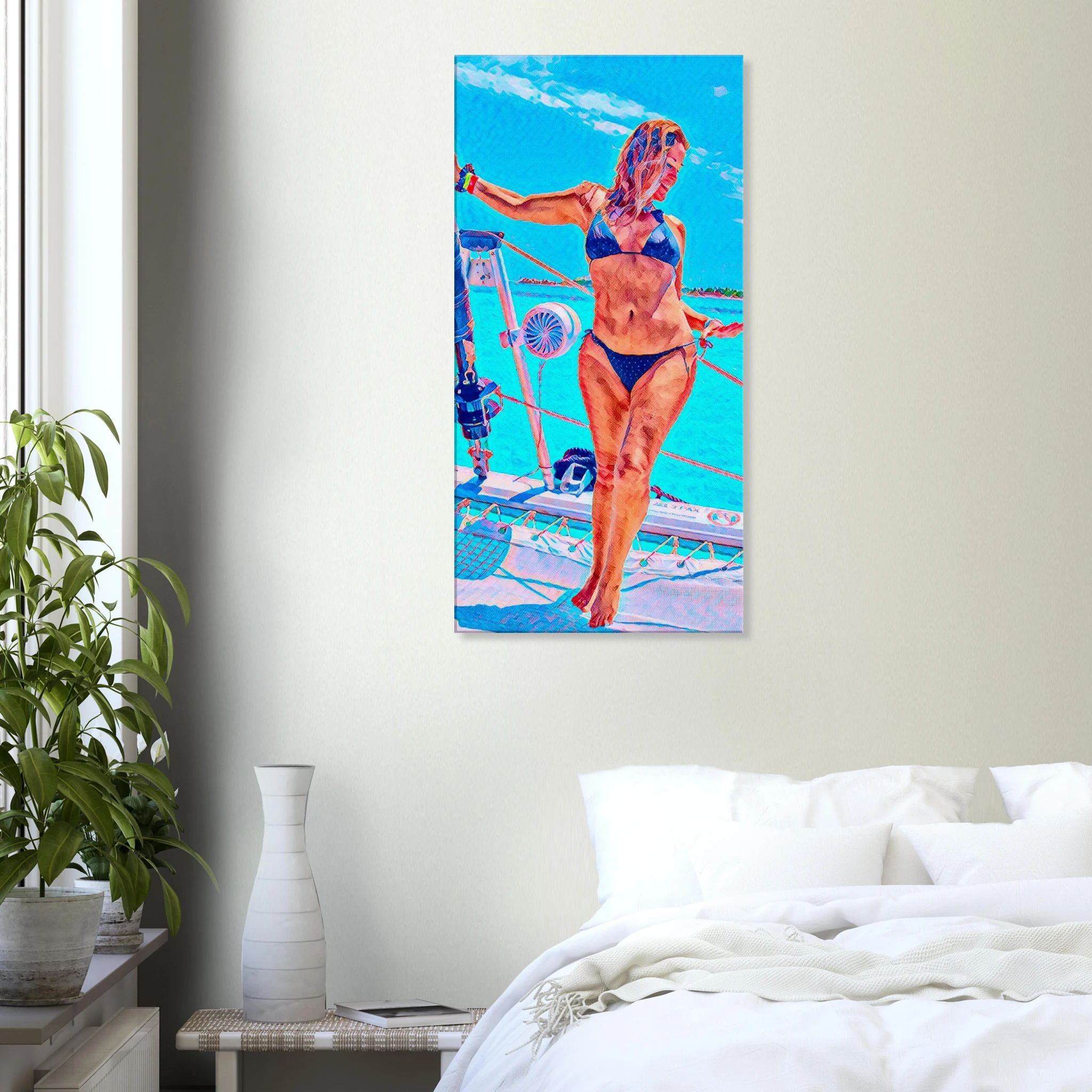 La impresión sobre lienzo realza cada matiz dorado, cada reflejo azul del Caribe que la envuelve.
