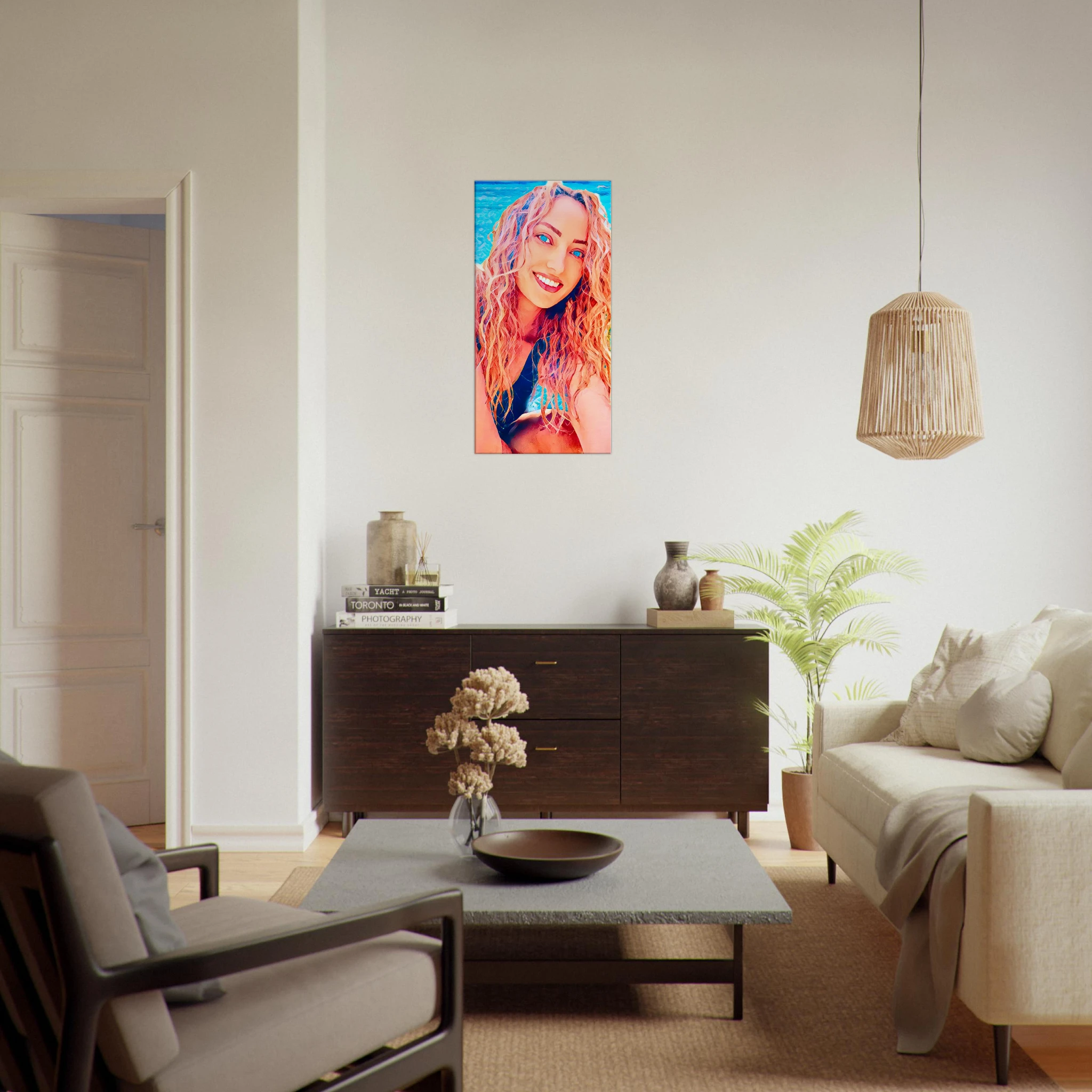 Esta obra se imprime sobre lienzo texturizado de calidad museo, realzando cada curva, cada sombra cálida, cada rizo que parece moverse al compás del mar.